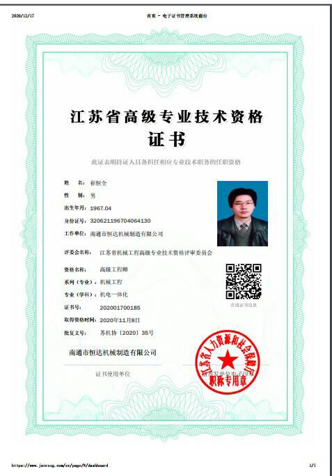 經(jīng)過書面材料審核,常州現(xiàn)場面試,南通恒達(dá)公司董事長崔恒全同志通過層層考核,獲評高級工程師并頒發(fā)證書。
